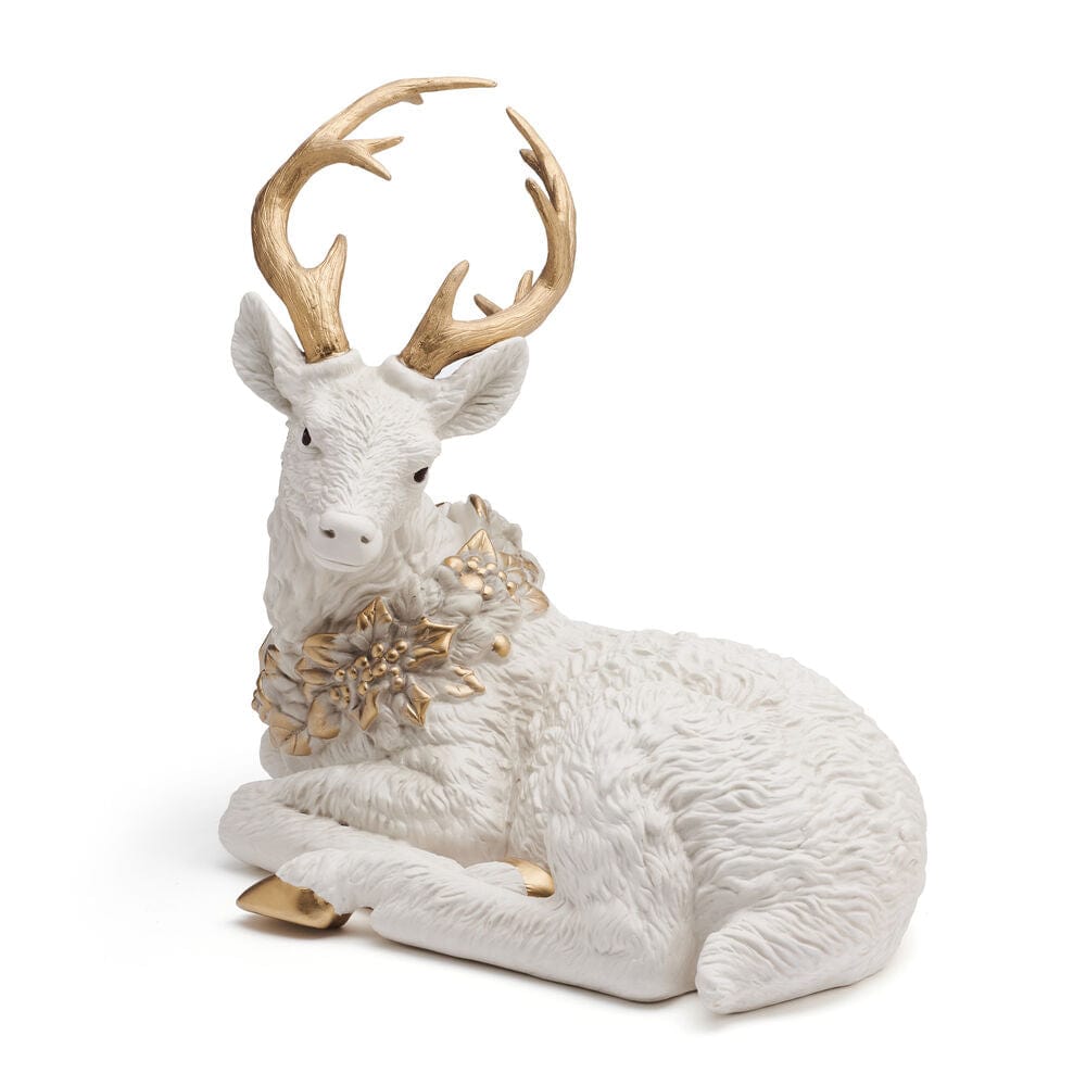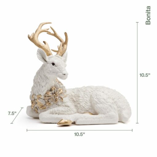 This Bonita Resting Deer Figurine is regal and festive and is vibrant white with golden accents, this magnificent deer is curled up for comfort with a wreath of poinsettias around its neck. • Crafted of Earthenware • Hand wash recommended • Packaged in a gift box, perfect for gifting • Measures 10-1/2 inches high by 10-1/2 inches long by 6-1/2 inches wide