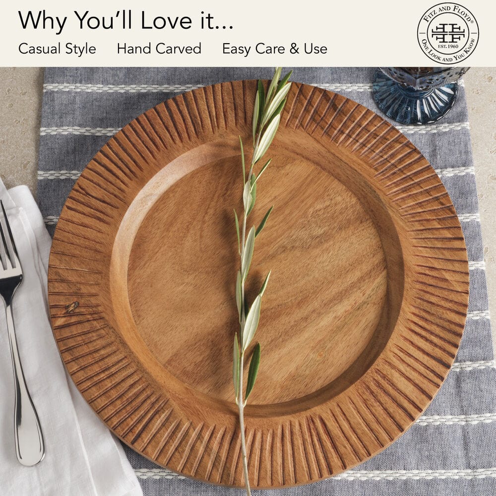 These Caleb Acacia Wood Set of 2 Chargers will bring a bold visual element to your tabletop. • Crafted of Acacia Wood • Hand wash with warm water and a mild detergent then rinse and dry immediately • Measures 12-3/4 inches in diameter by 1 inch high
