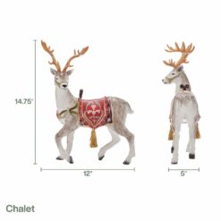 This Chalet Deer Figurine is beautifully hand-painted with stunning detail, featuring a lovely deer that stands at attention with its impressive antlers held high, and a colorful saddle draped over its back. Sized to impress, it will highlight your home, whether used as a centerpiece on a table or displayed on a shelf or fireplace mantel. • Crafted of Earthenware • Dust gently with a soft cloth • Measures 12 inch long x 5 inch wide x 14-3/4 inch high