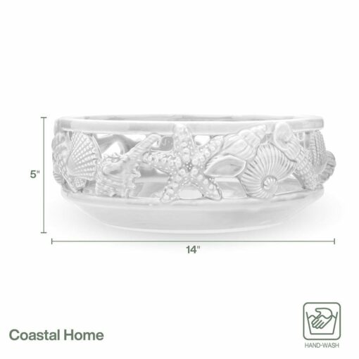 This Coastal Home Centerpiece Bowl is adorned with intricately detailed seashell and starfish accents and will make a mesmerizing centerpiece display. • Crafted of Earthenware • Handwashing Recommended • Measures 14 inch diameter x 5 inch high • Packaged in a brown box
