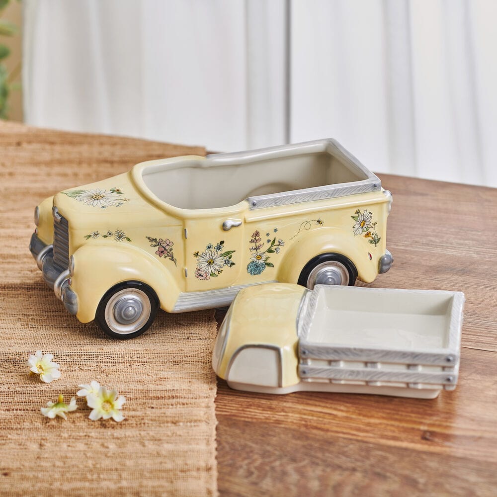 Add a charming and functional display piece to your countertop or table with this Emi’s Garden Pickup Truck Cookie Jar, which is beautifully crafted and hand-painted for a unique, detailed look. The interior is generously sized to store cookies, candy, sugar, coffee, and more, and the removable lid helps keep the contents fresh.