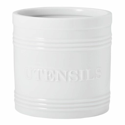 This Everyday White Bistro White Utensil Crock keeps all your essential food prep tools neat, organized, and always in reach on your countertop. This basic white crock features double band accents and the word UTENSILS embossed on the body, and complements any kitchen decor. •Dimensions: 6-inches high and 5-3/4 inches in diameter • Crafted of Porcelain • Dishwasher safe