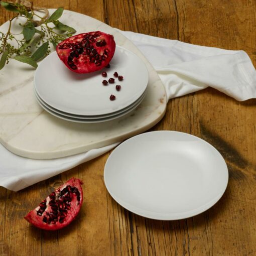 This Everyday White Coupe Set of 4 Salad Plates feature contemporary, coupe shapes, will add understated style to any dining occasion, and are perfect for everyday use or formal entertaining. Beautifully crafted of porcelain. Set of 4 salad plates, each measures 7-3/4 inch diameter x 7/8 inch high. Microwave, dishwasher and oven safe up to 450 degrees.