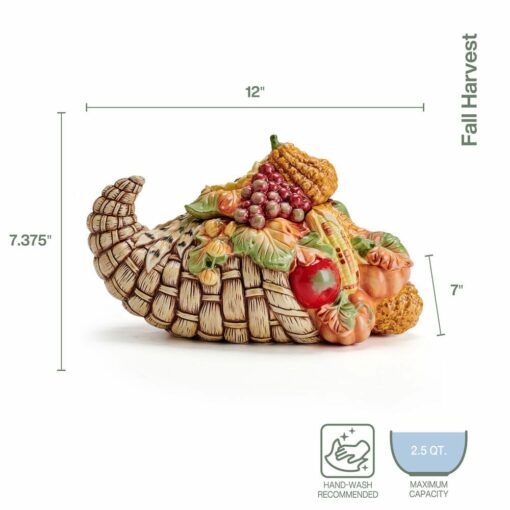 This strikingly detailed Fall Harvest Cornucopia Cookie Jar celebrates the iconic symbol of the harvest season in a prism of autumnal colors. Both decorative and functional, this elegant cookie jar is a perfect way to store and keep a bounty of delicious cookies and other sweet snacks fresh. Beautifully designed and handcrafted of ceramic earthenware by Fitz and Floyd artisans. • Measures 7-3/8 inches high by 12 inches long by 7 inches wide. • Crafted of Earthenware. • Hand-wash with warm water and a mild detergent; rinse and dry immediately. • Packaged in a Gift Box perfect for gifting.