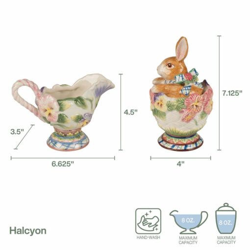 This Halcyon Rabbit Sugar and Creamer Set is adorned with pastel flowers and leaves, with an adorable bunny serving as the lid to the sugar bowl. Not only ideal for bringing cream and sugar to the table, this set is also the perfect home decor item for spring, Easter, and Mother’s Day. • Crafted of Earthenware • Handwashing Recommended • Creamer measures 3-1/2 inch wide x 6-5/8 inch long x 4-1/2 inch high; Sugar Bowl measures 7-1/2 inch diameter x 7-1/8 inch high • Each hold 8 ounces • Packaged in a brown box