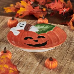 This Halloween Pumpkin and Ghost Figural Snack Plate features a smiling Jack-o-lantern face with a friendly ghost peeking over the top, and is perfect for serving spooky snacks and treats. • Crafted of Earthenware • Handwashing Recommended • Measures 7 inch diameter • Packaged in a brown box