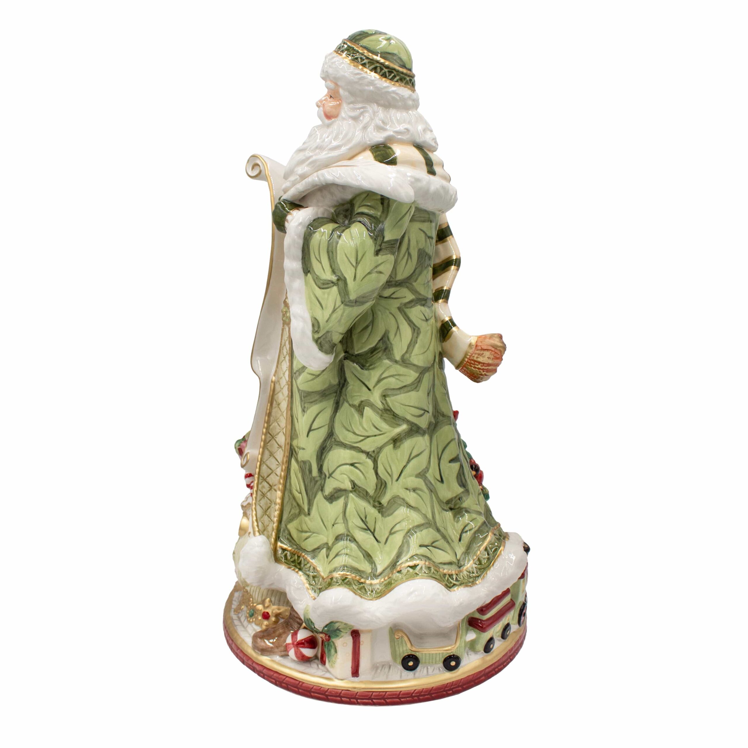 This Holiday Home Green Santa Figurine features Santa Claus all ready to deliver his bag of toys, yet taking a moment to check his list twice! Sized to impress, it will be the highlight of your home, whether used as a centerpiece on a table or displayed on a fireplace mantel. • Crafted of beautifully hand-painted Earthenware • Dust gently with a soft cloth • Packaged in a gift box, perfect for gifting • Measures 11 inch long x 10 inch wide x 18-3/4 inch high