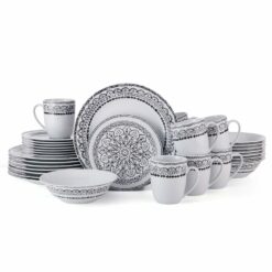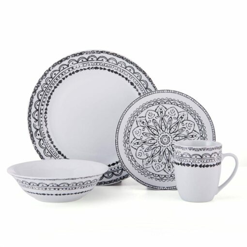 This Ink Delight Dinnerware Set is a stunning fusion of contemporary and classic, featuring a crisp white background, adorned with an intricate pattern of interweaving circles and lines, inspired with bold medallion design, adding an elegant and enthralling addition to your tabletop display. • Dinnerware Set for 8 : This 32 piece dinnerware set, includes 8 each of: 10-1/2 inch dinner plate 7-1/2 inch salad plate, 7 inch diameter x 2-1/4 inch high (22 ounce) soup cereal bowl, and 12 ounce mug • Crafted of Porcelain • Microwave and Dishwasher safe