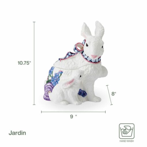 Introduce a delightful touch of whimsy to your kitchen with the Jardin Rabbit Cookie Jar. This enchanting piece features a charming white bunny adorned with a colorful, patterned scarf, cradling her baby amidst beautifully detailed flowers. Perfect for storing cookies, candy, sugar, flour, and more, the removable lid ensures your treats stay fresh. Handcrafted with durable, glazed earthenware and meticulously hand-painted, each jar is a unique work of art. This timeless cookie jar combines functional storage with elegant springtime décor.