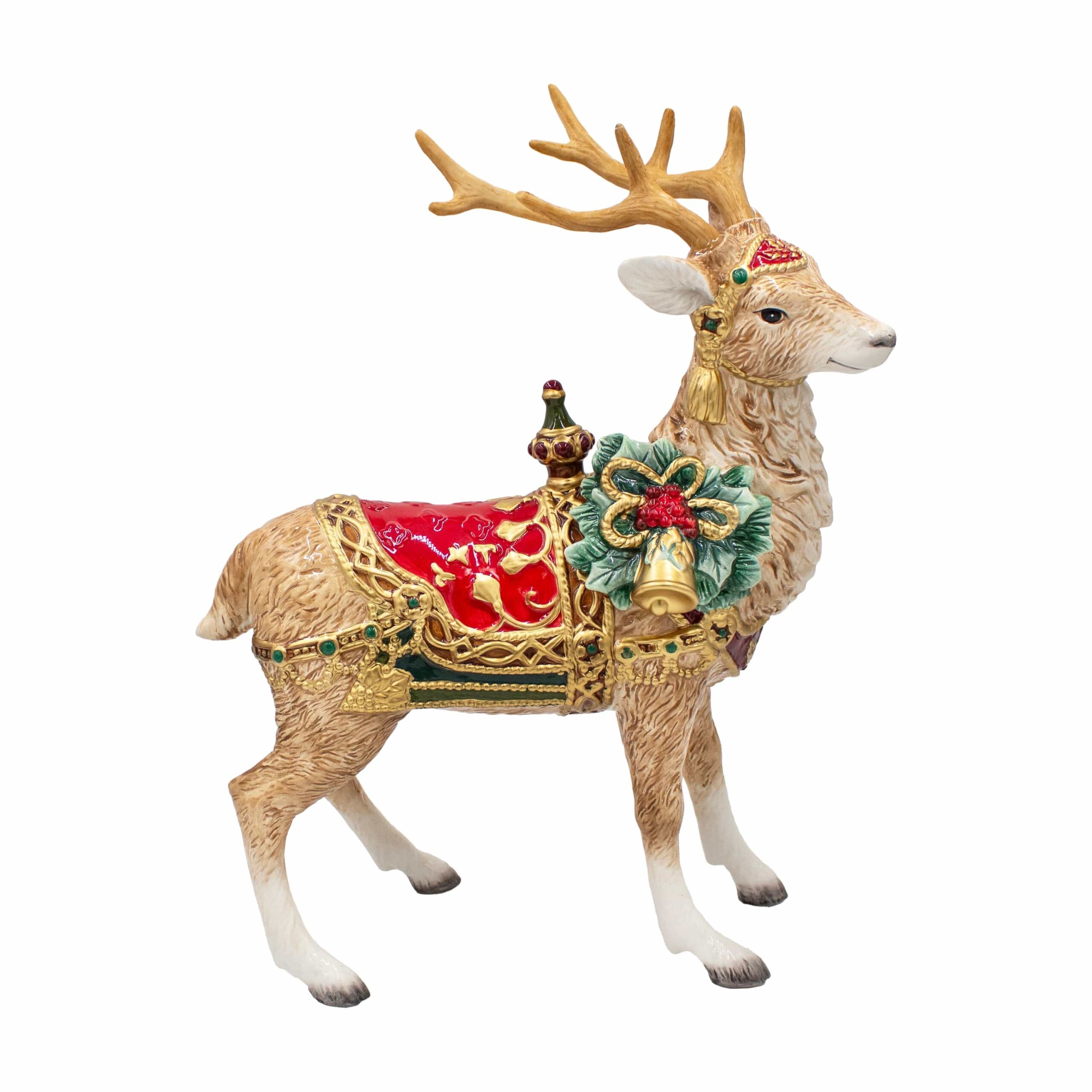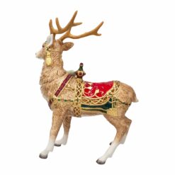 This Noel Holiday Grand Deer Figurine features an intricately detailed deer, adorned with a vibrant red, green, and gold saddle and holly, berries, and bell accent. Makes a lovely display piece, and will bring seasonal elegance to your home. • Crafted of Earthenware • Dust gently with a soft cloth • Packaged in a gift box, perfect for gifting • Measures 13-1/2 inch long x 7 inch wide x 17-3/4 inch high