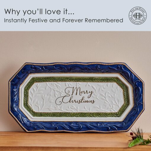 Bring a festive, celebratory feel to all your holiday gatherings with this Telluride Blue Bread Tray. This elegant bowl in regal blue with a white center and green and gold accents features a raised garland design around the rim and the sentiment “Merry Christmas” in the center. Generously sized, this tray is perfect for serving sliced loaves of bread as well as appetizers, cookies, and more. • Measures 17-1/4 inches long by 9-1/4 inches wide by 1-1/2 inch high • Crafted of Earthenware • Packed in a decorative box, perfect for gifting • Hand-washing recommended to extend the life of the product.
