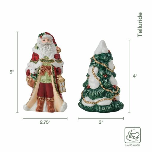 Bring holiday cheer to the table with this Telluride Santa Salt and Pepper Set. Crafted with great attention to detail, this charming set features a colorful Santa and a Christmas tree set. Functional and festive, it’s the perfect accent piece for your seasonal tabletop display. • Christmas tree shaker measures 4 inches high by 3 inches in diameter; Santa shaker measures 5 inches high by 2-3/4 inches in diameter. • Crafted of Earthenware. • Hand-washing recommended to extend the life of the product.