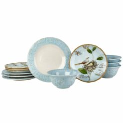 Take a look into nature’s sketchbook at the Toulouse Blue Dinnerware Set featuring soft shades of blues and taupes with a hand thrown textured look of solid color pottery with spontaneous glaze and debossing. Inspired from preserving nature’s gifts of a garden with song birds, butterflies and handwritings from old Europe with a feeling of eternal spring, this place setting will enhance any table. • 12 Piece Dinnerware Set includes 4 of each 11-inch dinner plate, 9-inch salad plate and 7-1/4 inch diameter by 3-1/4 high bowl with 28 fluid ounces. • Crafted of durable stoneware. • Microwave and dishwasher safe.