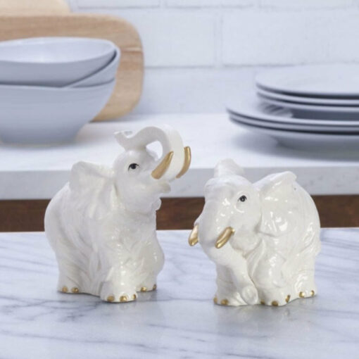 This Villa Palm Elephant Salt and Pepper Set features stunningly detailed white elephant shaped shakers, each uniquely posed to easily distinguish the salt and pepper, and adorned with golden accents that add elegance to the delightful presentation and bring a dash of charm to the dining table. • Crafted of Earthenware • Hand washing Recommended • Measures 4 inch long x 2 inch wide; Small 3-1/4 inch high, Large 4 inch high • Packaged in a brown box